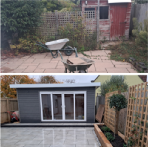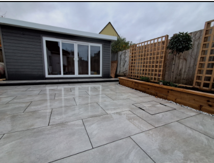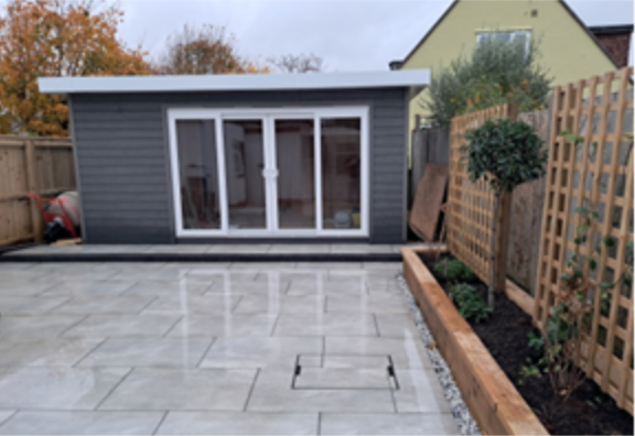 This project we created a new outbuilding space and outdoor porcelain dining area. Already booked in to create the garden the customer was unaware we could do the garden outbuilding. Providing a plan, they said can you do better than what we already have quoted. We double the timber and insulation sizes on the existing spec. Made it bigger with UPVC doors and composite cladding for cheaper than they had quoted for what was essentially a shed. We used juniper argent grey porcelain with a non-permeable flow point grout finish for a long-lasting finish. Total area was 70m2 in this project with a continuation of the existing Indian sandstone of the other side of the garden.